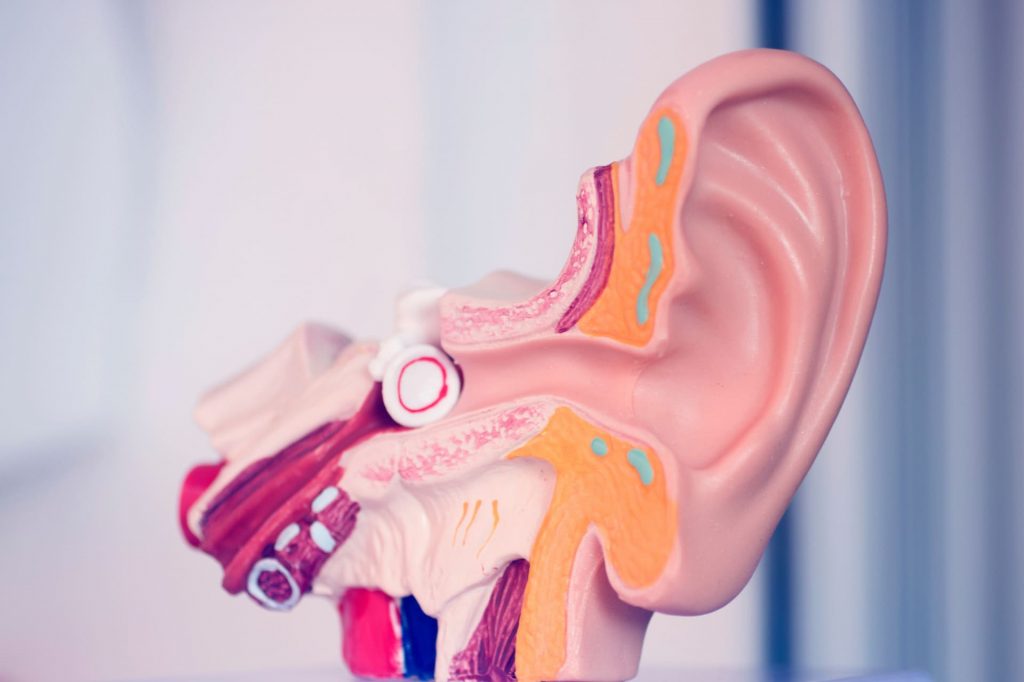The otoliths have the shape of crystals of a chandelier and hang on the walls of the otolith organs. They are microscopic crystals of calcium carbonate that lie on a gelatinous membrane. When you tilt your head, the crystals accelerate in relation to the hair cells on which they lie. The upper and lower parts of the hair cells move in opposite directions (shear force). This movement is recognized by the hair cells and sent to your brain as information about your head position and movement.